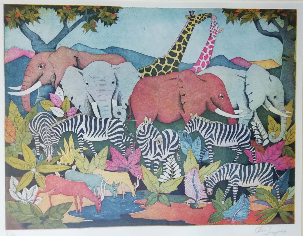 George Lilanga (1934 – 2005) is one of the most famous contemporary artists from Tanzania and one of the most celebrated artists on the continent. He was not a Tinga Tinga artist, but worked with them in Dar es Salaam and took over some of his techniques in his work.