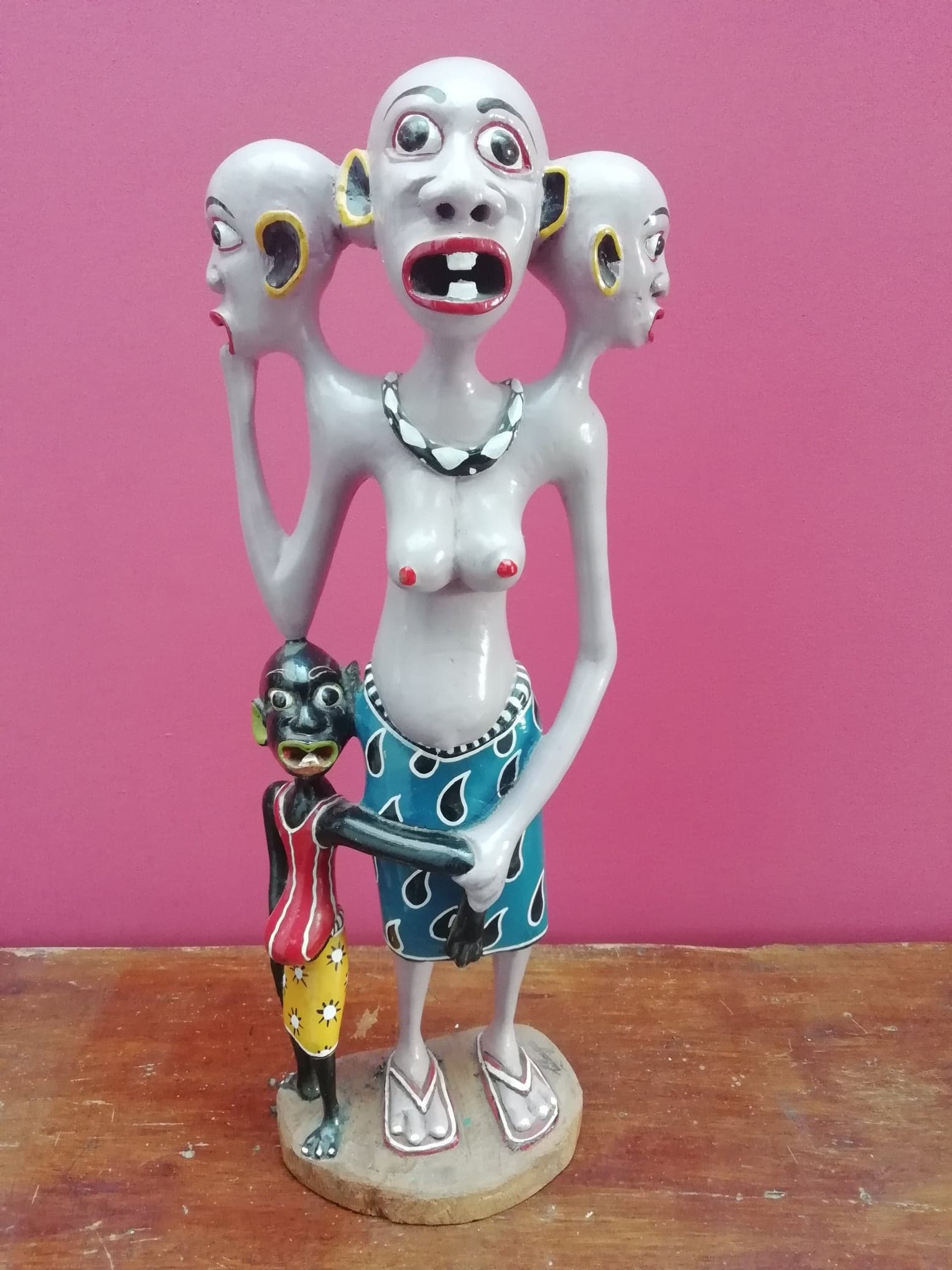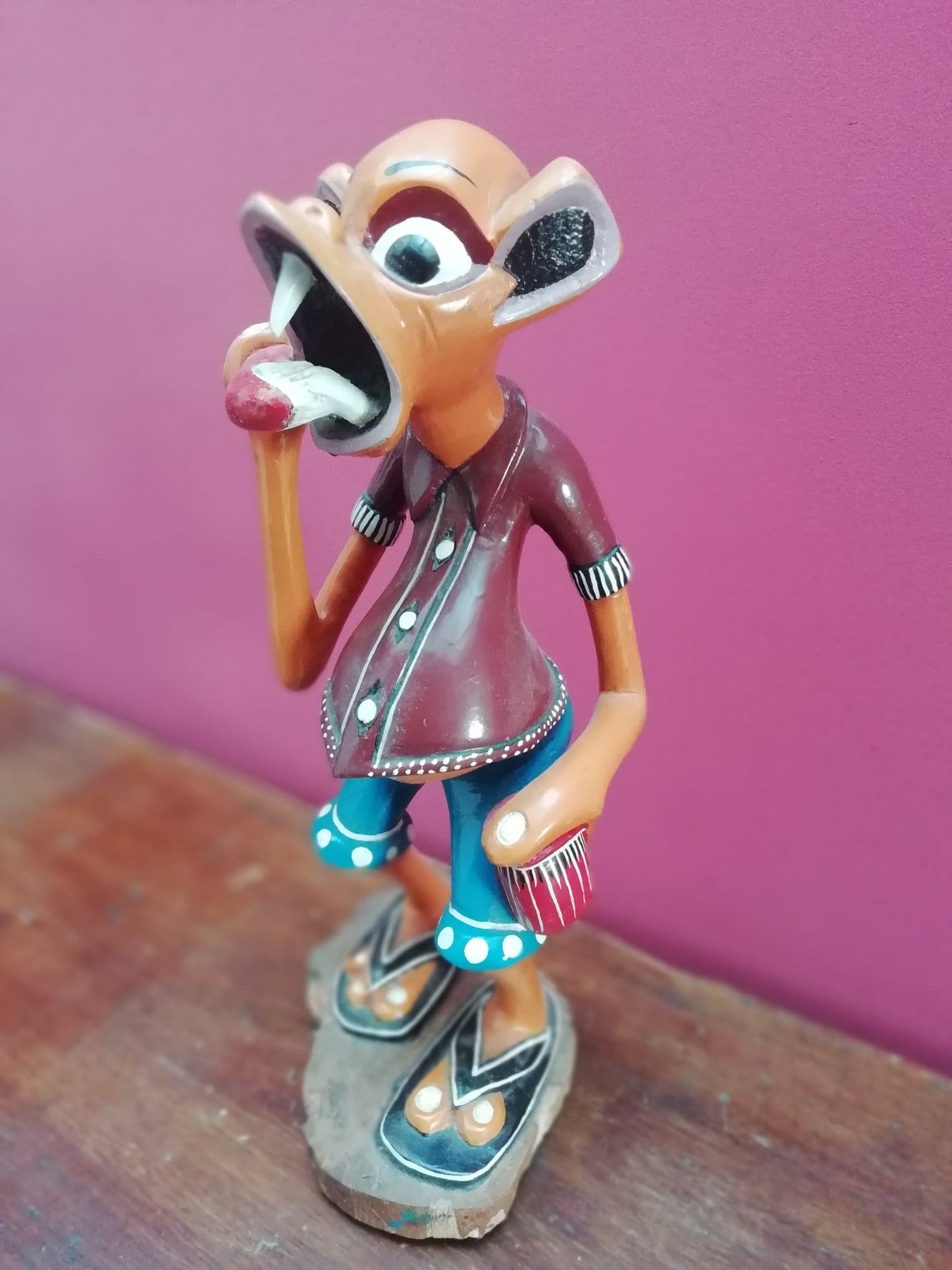 He put his figures to two dimensions, painted in the same clear and bright glaze paint and even to etchings and lithographs. His universe of shetani spirits gives a lively and humorous impression and is immediately recognizable. It became a big trademark just like the graffiti-inspired figures of Keith Haring (with whom he was often compared).